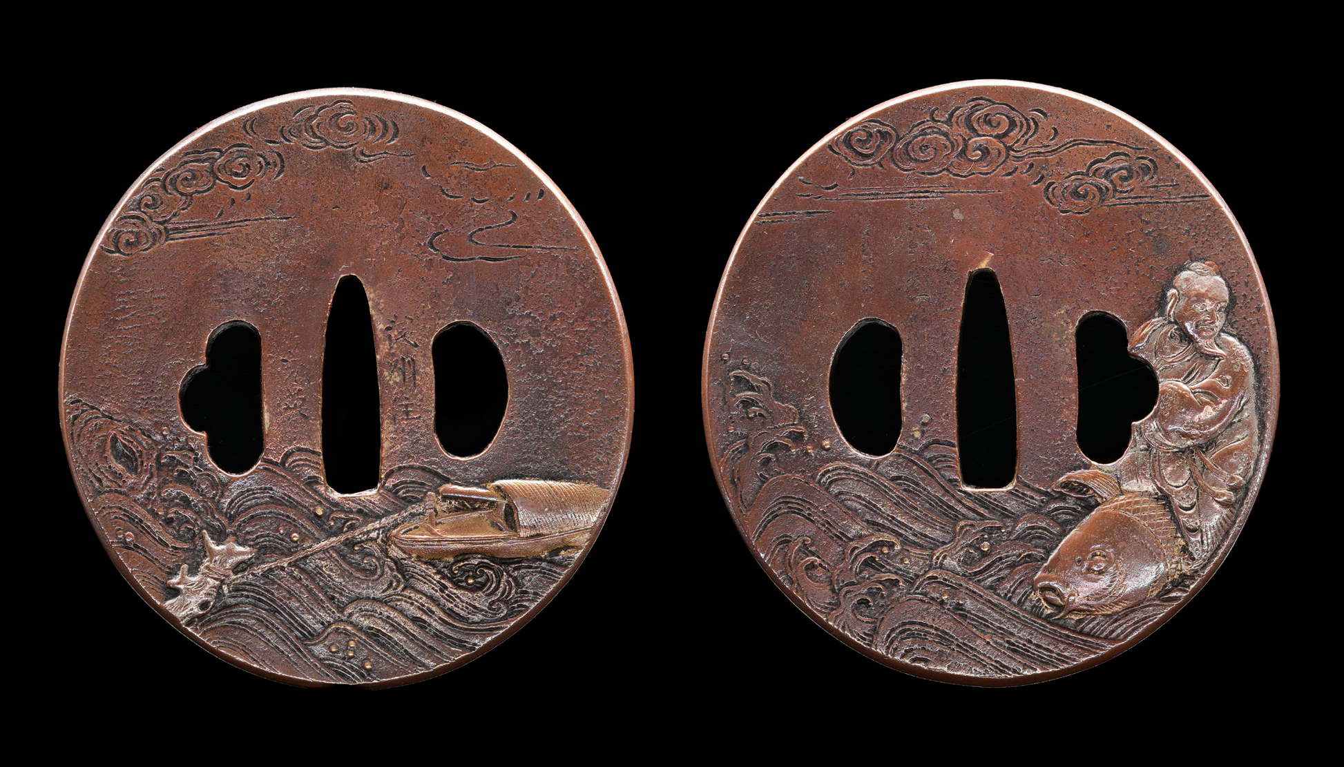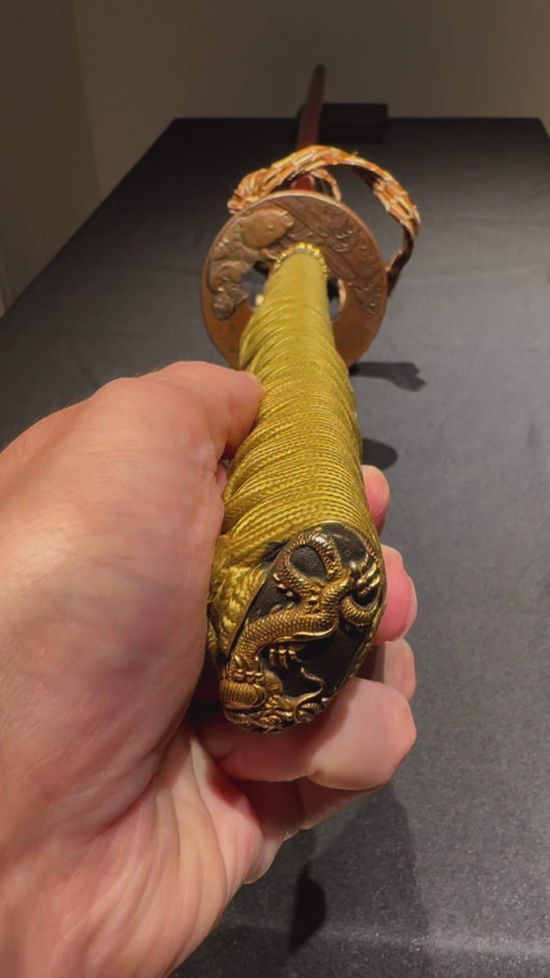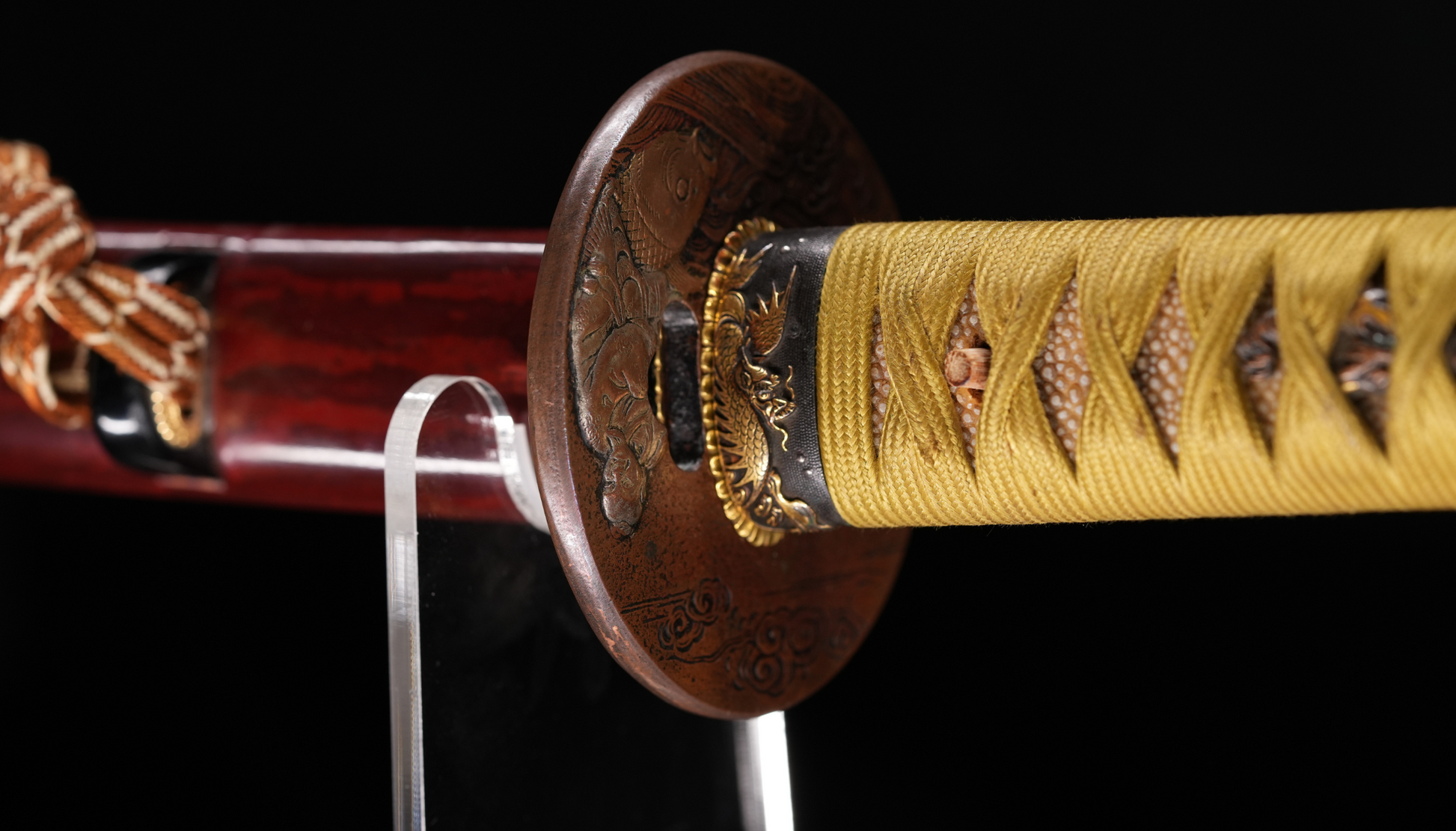 Le koshirae est tout aussi impressionnant. Le fuchi-kashira, ou pommeau et collier, sont faits de shakudo (un alliage d'or et de cuivre) avec un motif d'œuf de poisson (Nanako-ji) et comportent un motif de dragon incrusté d'or (Kin-zogan de Ryu-zu). Les menuki, ou ornements de poignée, sont de grands dragons chassant une perle. La tsuba est faite de cuivre ordinaire de forme ronde avec un motif de carpe et de figure humaine. Le saya, est laqué dans une finition rouge vermillon poli