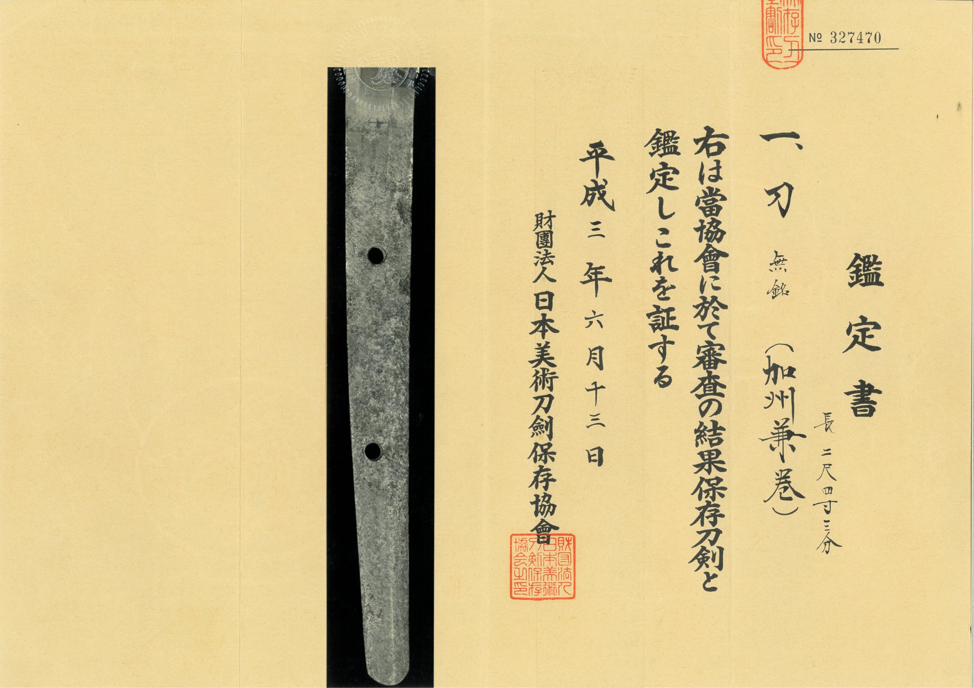 Le forgeron Kanemaki était originaire de la province de Mino et faisait partie de l'école Seki. Au début de la période Edo, il s'installe à Kanazawa, poursuivant son métier sur cinq générations. La deuxième génération fut convoquée à Komatsu par Maeda Toshitsune, un daimyo à la retraite résidant au château de Komatsu. Les générations suivantes retournèrent à Kanazawa pour poursuivre leur travail. Les épées signées avec des inscriptions telles que « Kashu Kanazawa ju Kanemaki » et « Kashu Komatsu ju Kanemaki » sont des exemples de leur savoir-faire. Ce katana témoigne de l'importance historique et de la qualité exceptionnelle qui caractérise la lignée Kanemaki.
