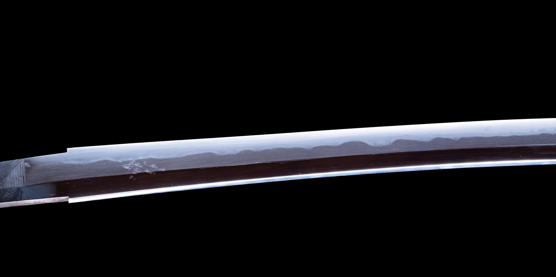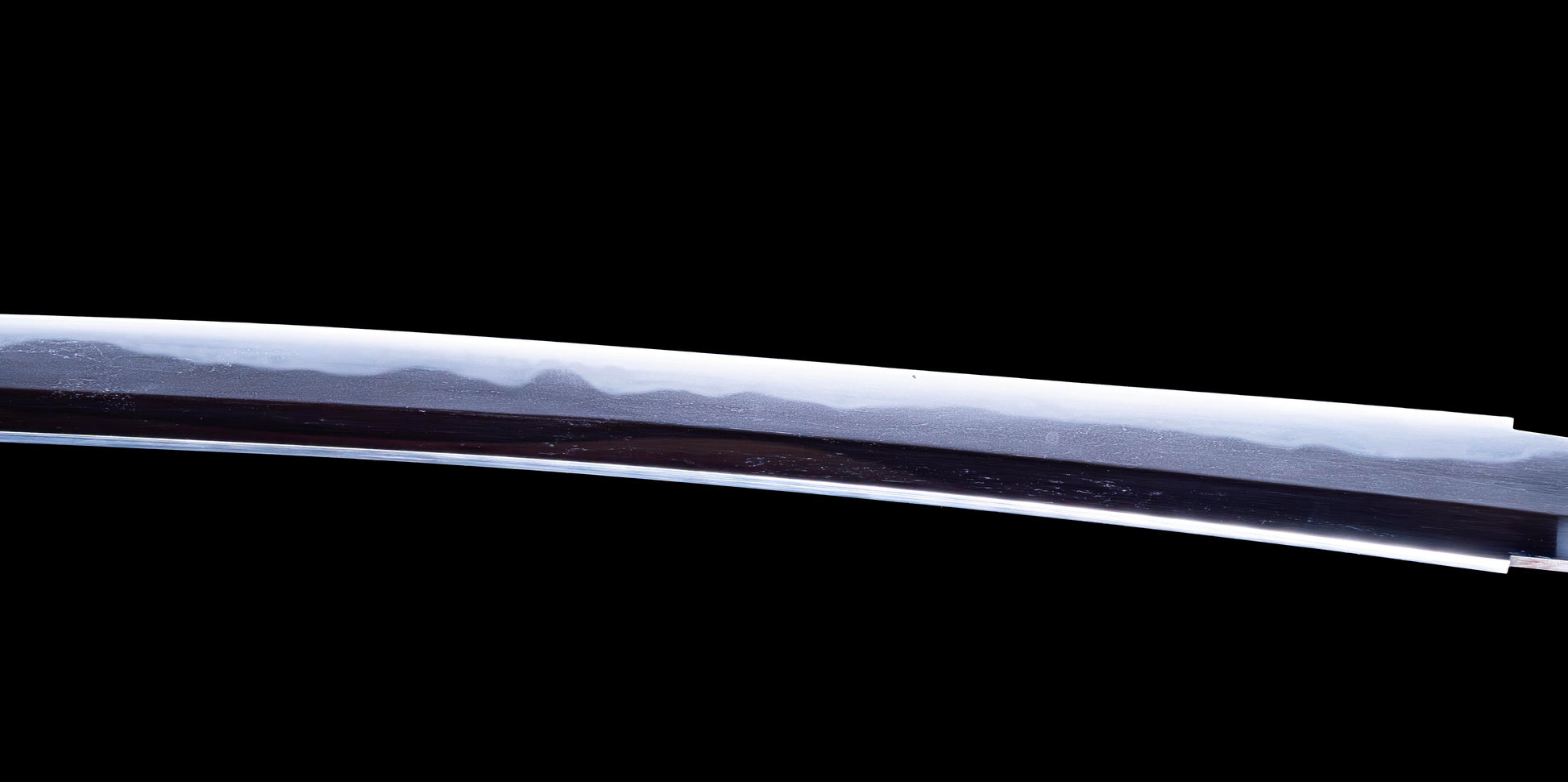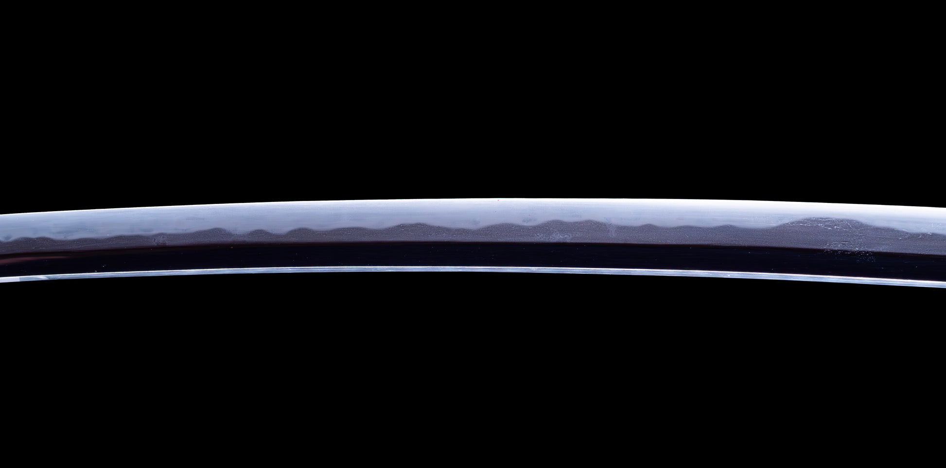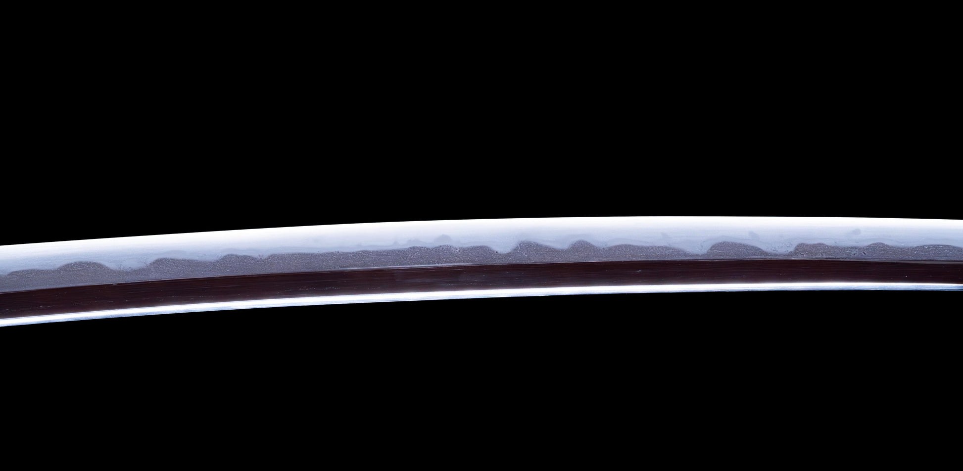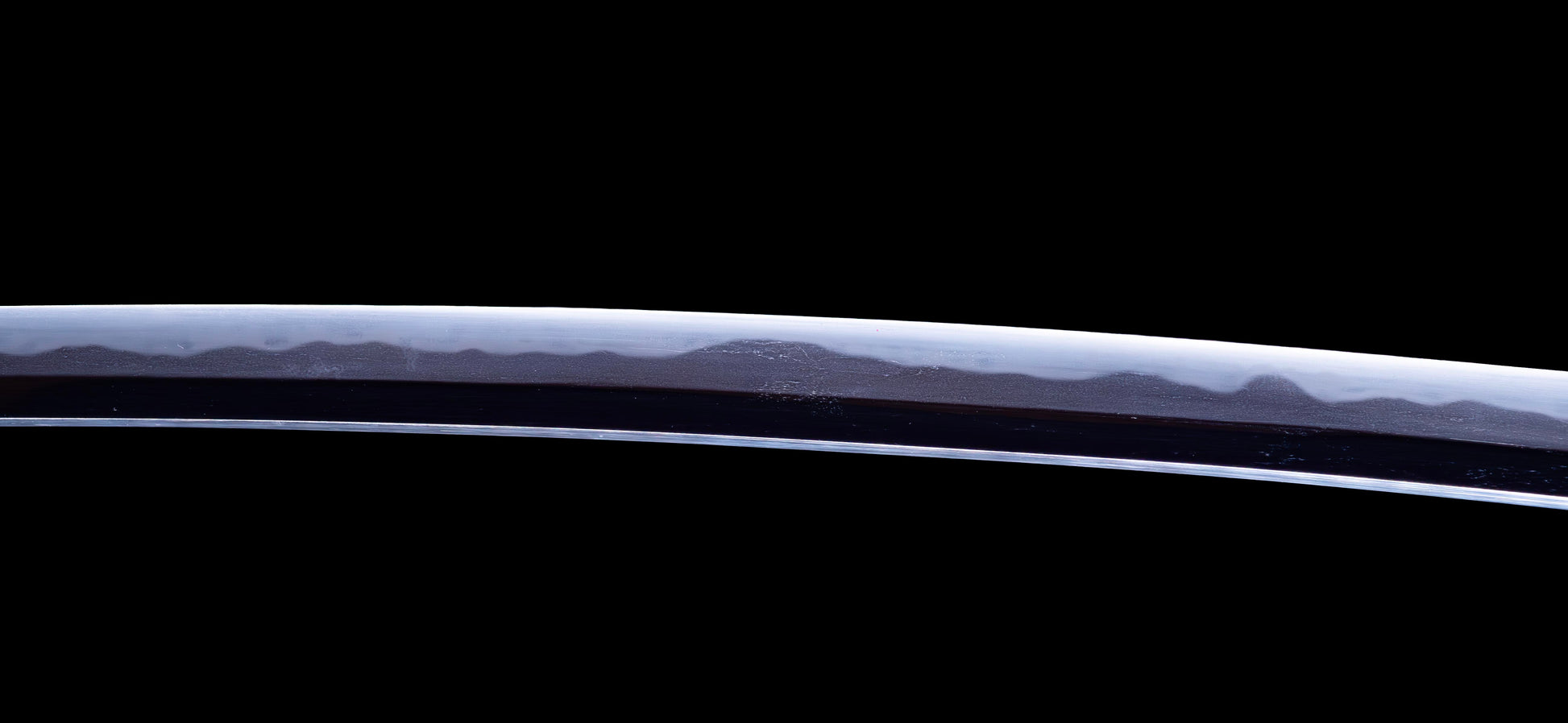 The hamon is an attractive midare pattern—an irregular wave combining rounded gunome elements in places with gentle notare undulation. It runs consistently from the base through the monouchi, showing a bright nioiguchi with fine internal activity under light. The well-defined ridge and ample motohaba 33.2 mm taper to a strong tip (sakihaba 24.6 mm), while a single mekugi-ana secures mounting.