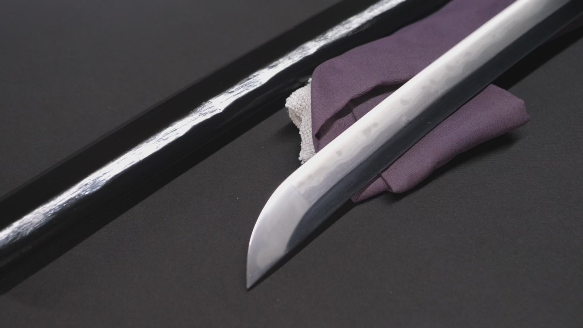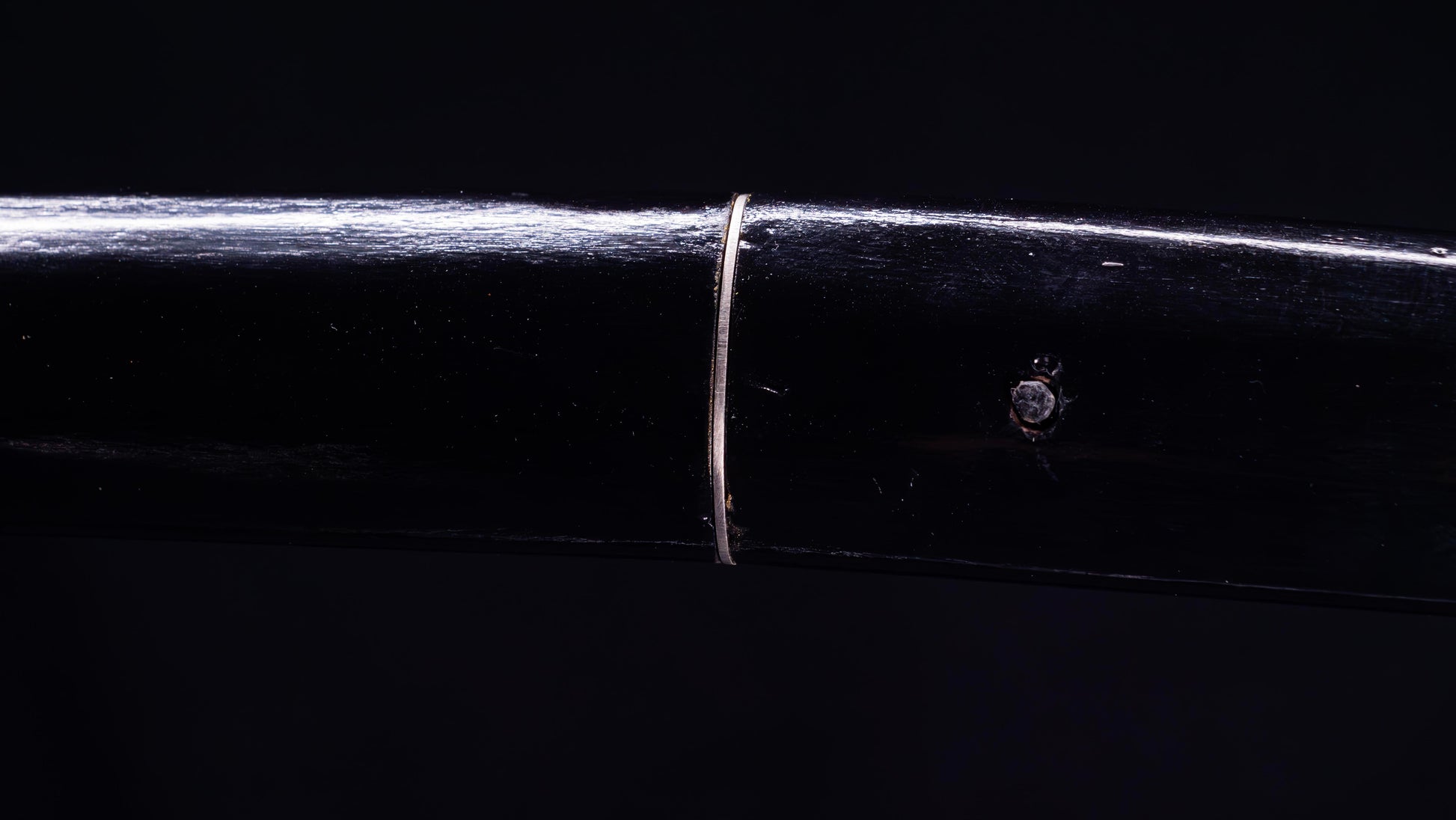 The sword is housed in a sleek high-gloss black lacquer scabbard fitted with a tight, well-made habaki.