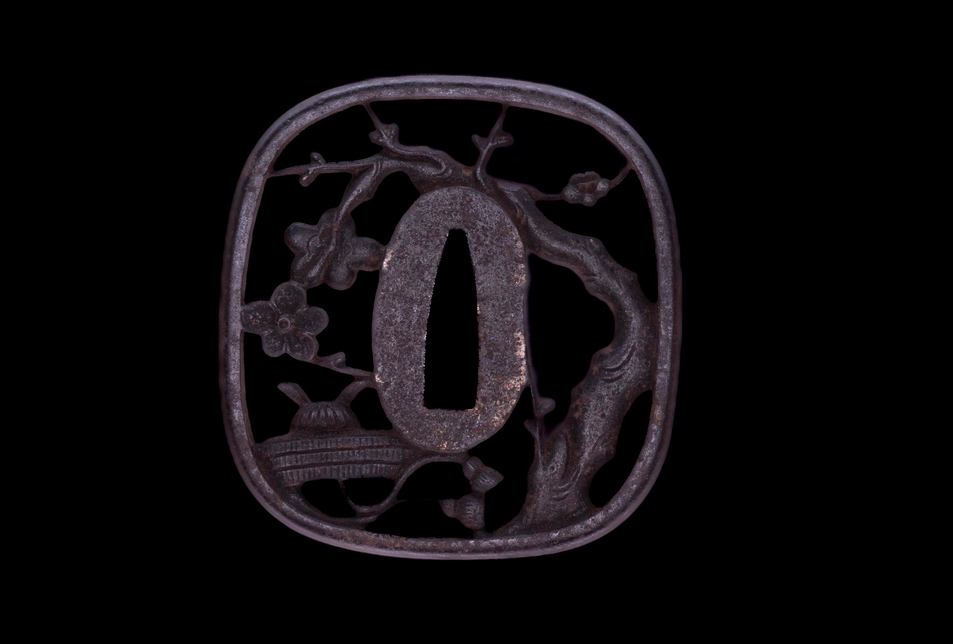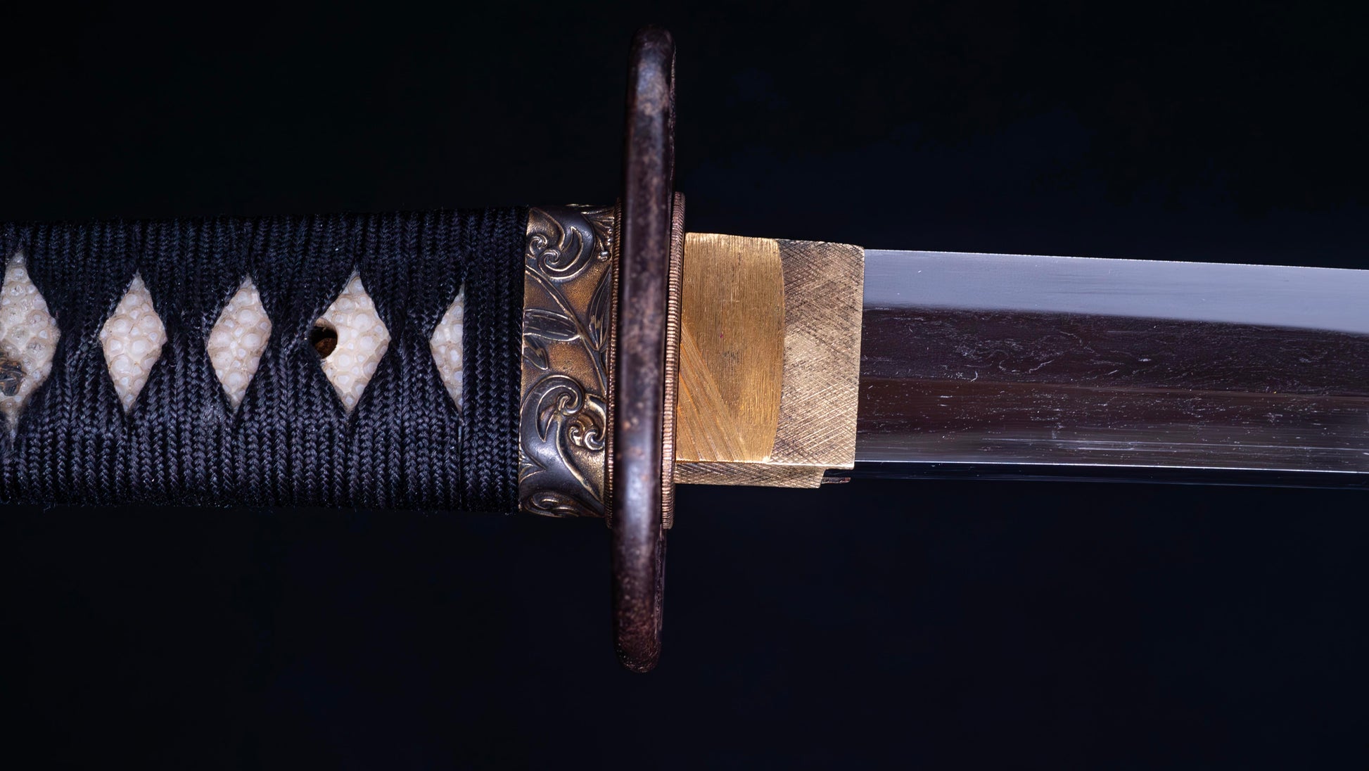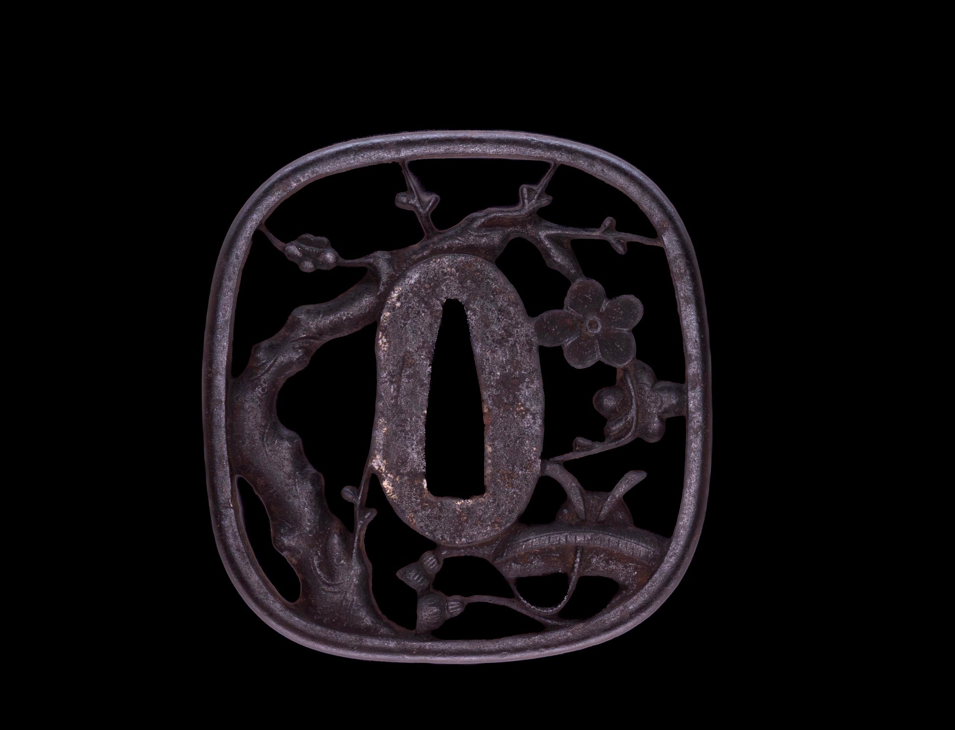 - Mounting (Koshirae): Complete koshirae — black lacquer saya with gold sageo, iron sukashi tsuba with plum blossom and branch motif, gilt floral fuchi-gashira, black silk ito over white samegawa