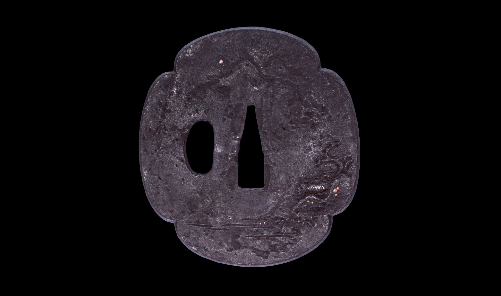 The tsuba is a large, heavily worked iron piece in a rounded kaku-mokko form, its entire surface given over to a richly atmospheric sansui-zu (mountain and water landscape). Pine trees, distant mountain silhouettes, and what appears to be a small boat among reeds are rendered in kebori (hairline engraving) and subtle relief against the deeply patinated iron ground, with scattered accents of gold and copper zogan (inlay) punctuating the composition. This is not the abbreviated decorative gesture of a workaday tsuba but a considered landscape composition — a miniature ink painting translated into iron by a smith who understood both the artistic tradition he was invoking and the technical demands of working it into metal. The single kozuka hitsu interrupts the composition naturally, and the overall iron surface has aged to a magnificent deep black that sets off the landscape's fine detail.
