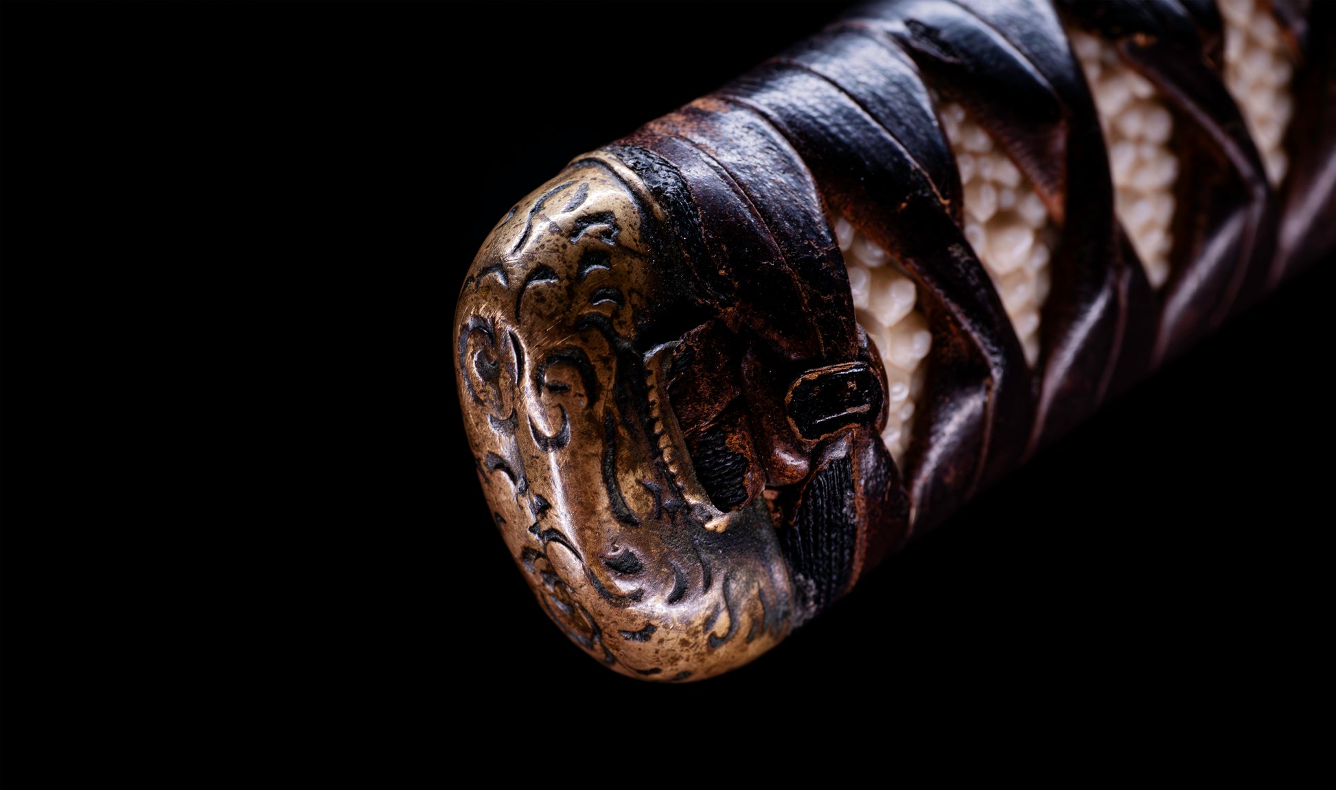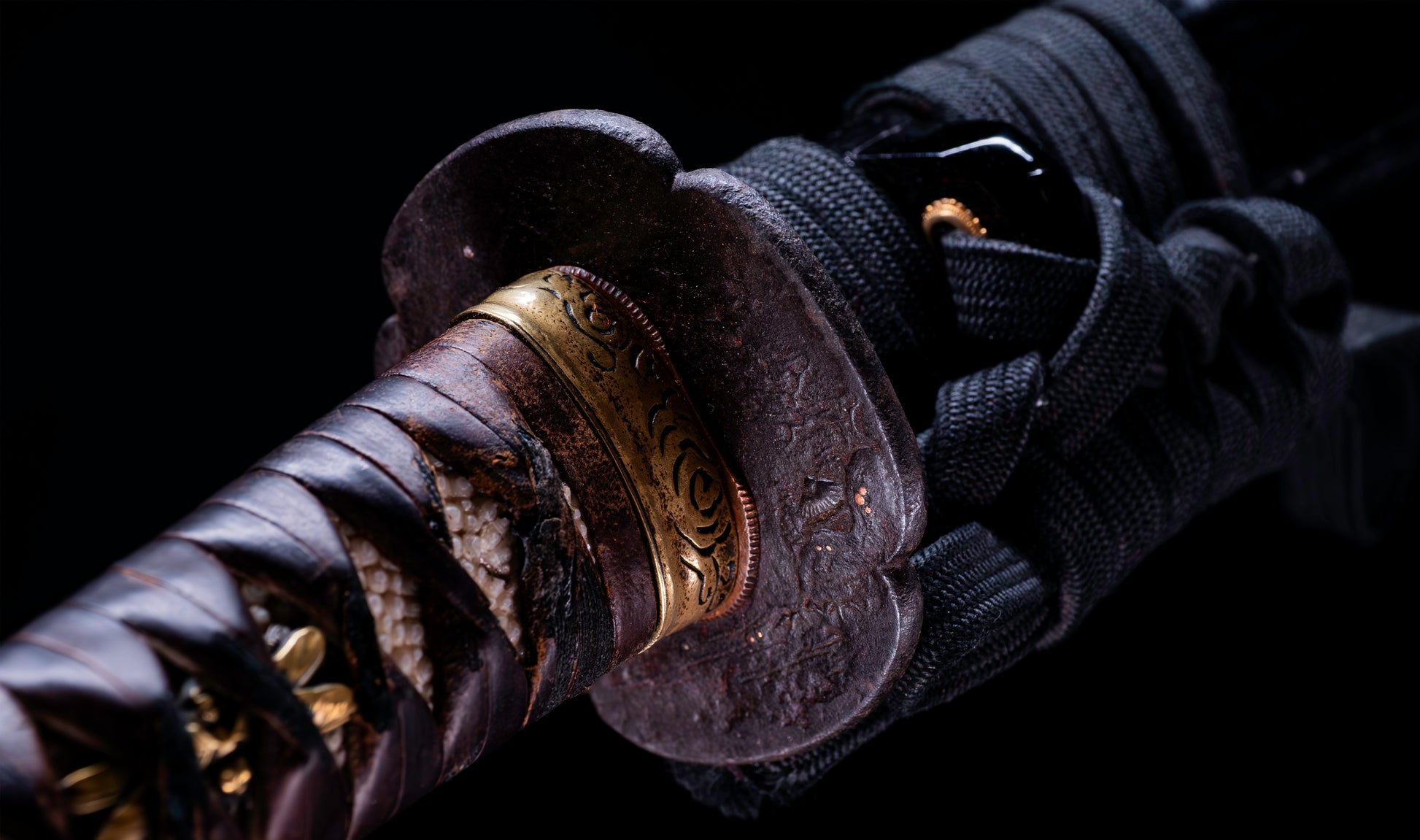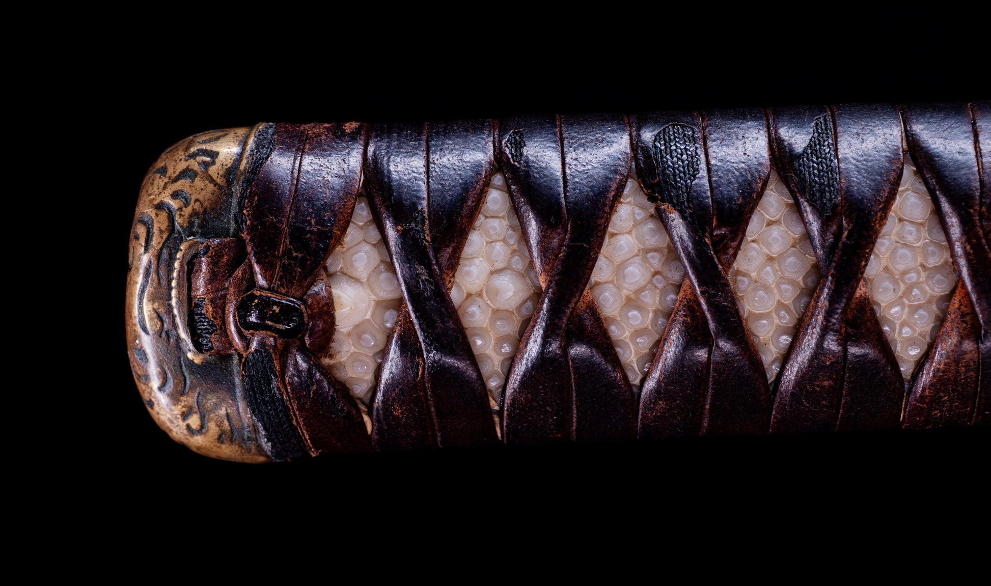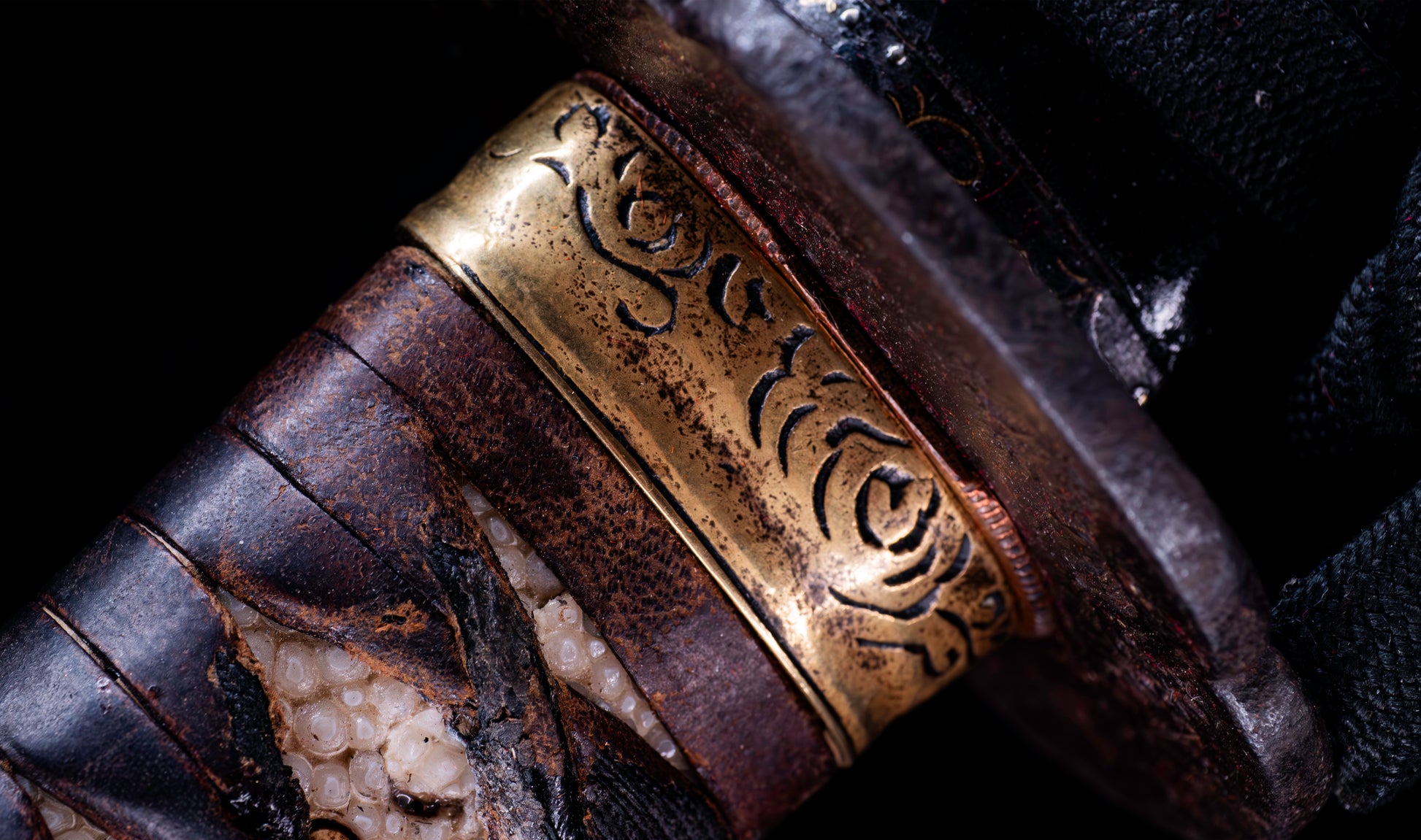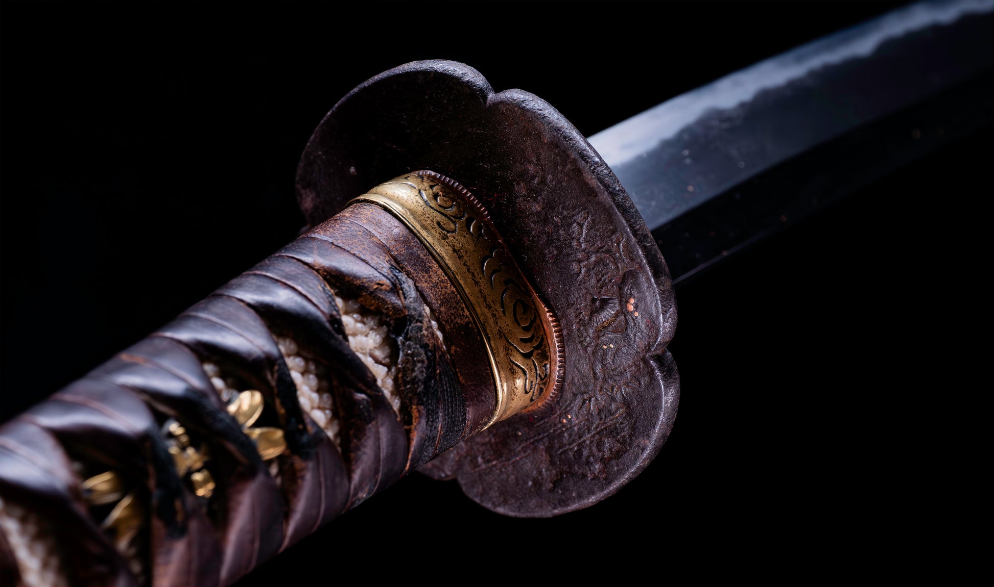 The fuchi-kashira set is worked in warm brass with bold karakusa (arabesque scrollwork) engraved into the surface — confident, flowing line work that provides elegant visual continuity between tsuka and blade. The habaki is a single-piece brass collar finished with tight horizontal yasurime ribbing, its warm golden surface providing a luminous transition between the iron tsuba and the blade above. The tsuka is wrapped in dark brown leather (kawa) in the classic hishi-maki diamond pattern over white same (ray skin), the leather having aged to a rich espresso tone that speaks of genuine period use. The nodules of the same are visible through each diamond aperture, and the overall handle presents with the honest, well-worn authority of a sword that has been handled and carried across the centuries.