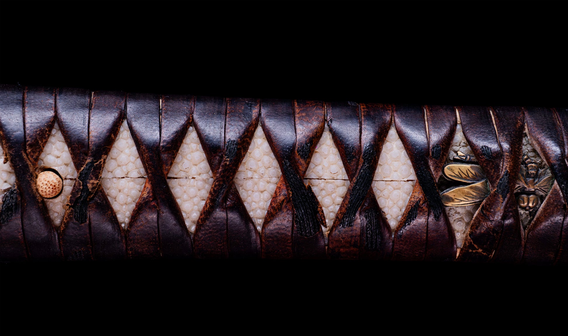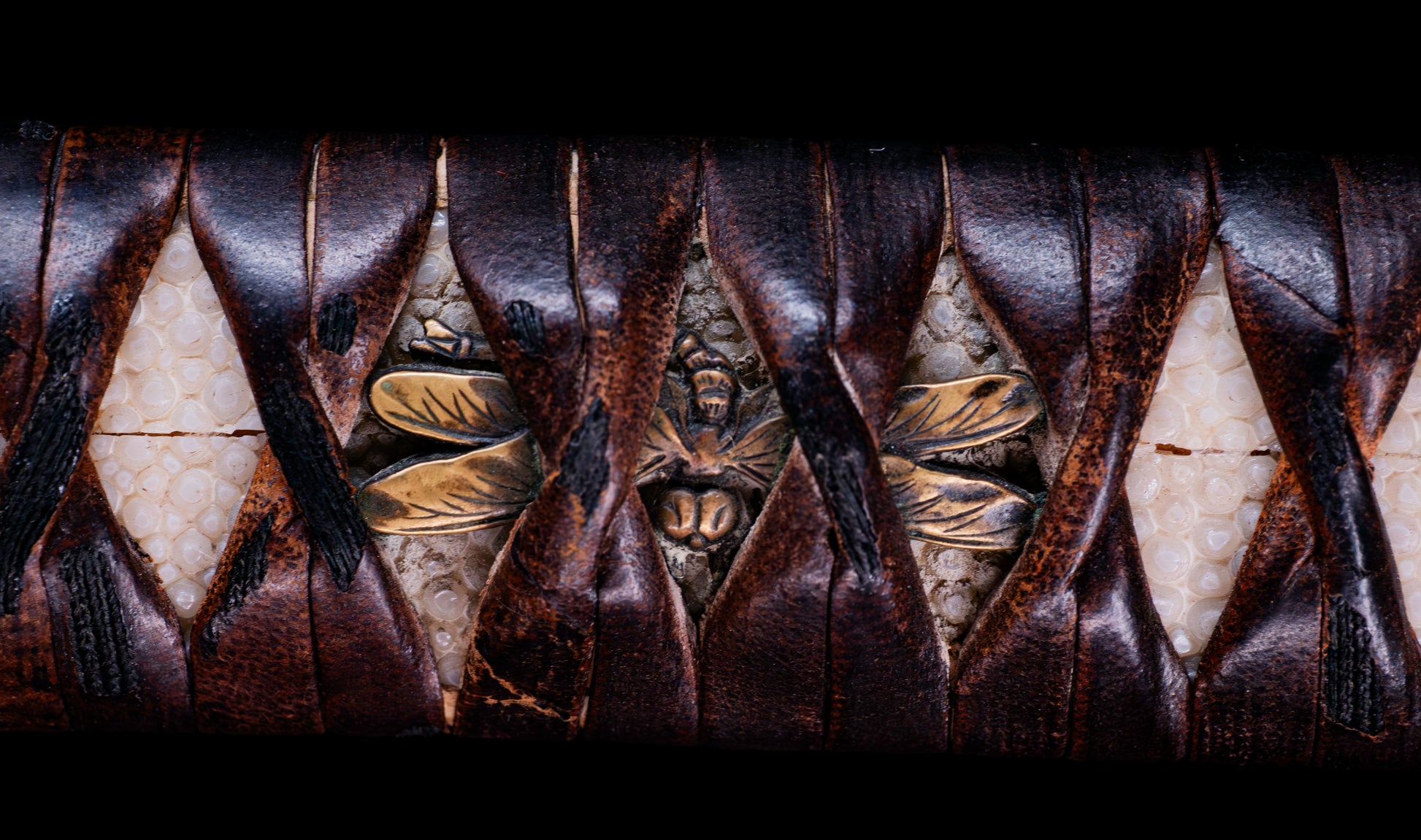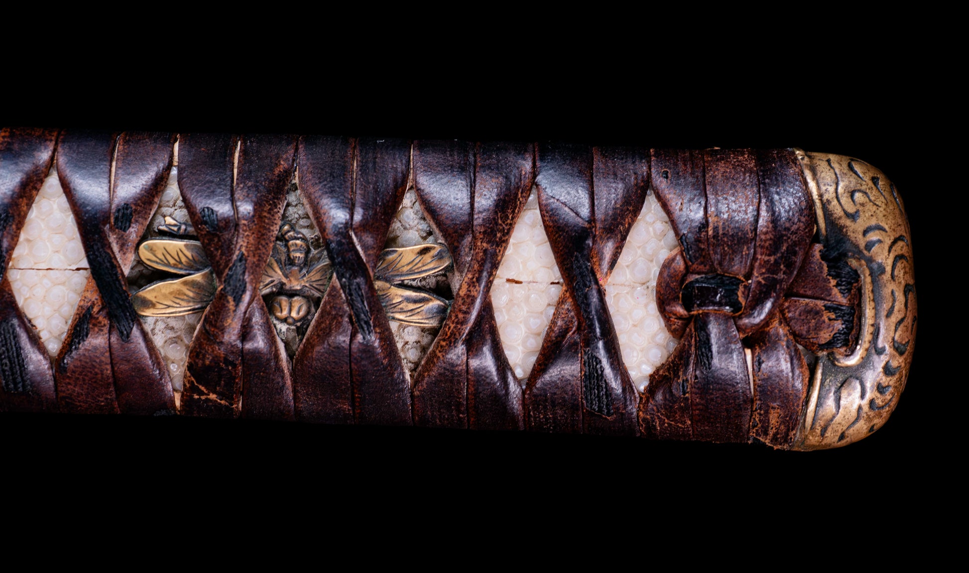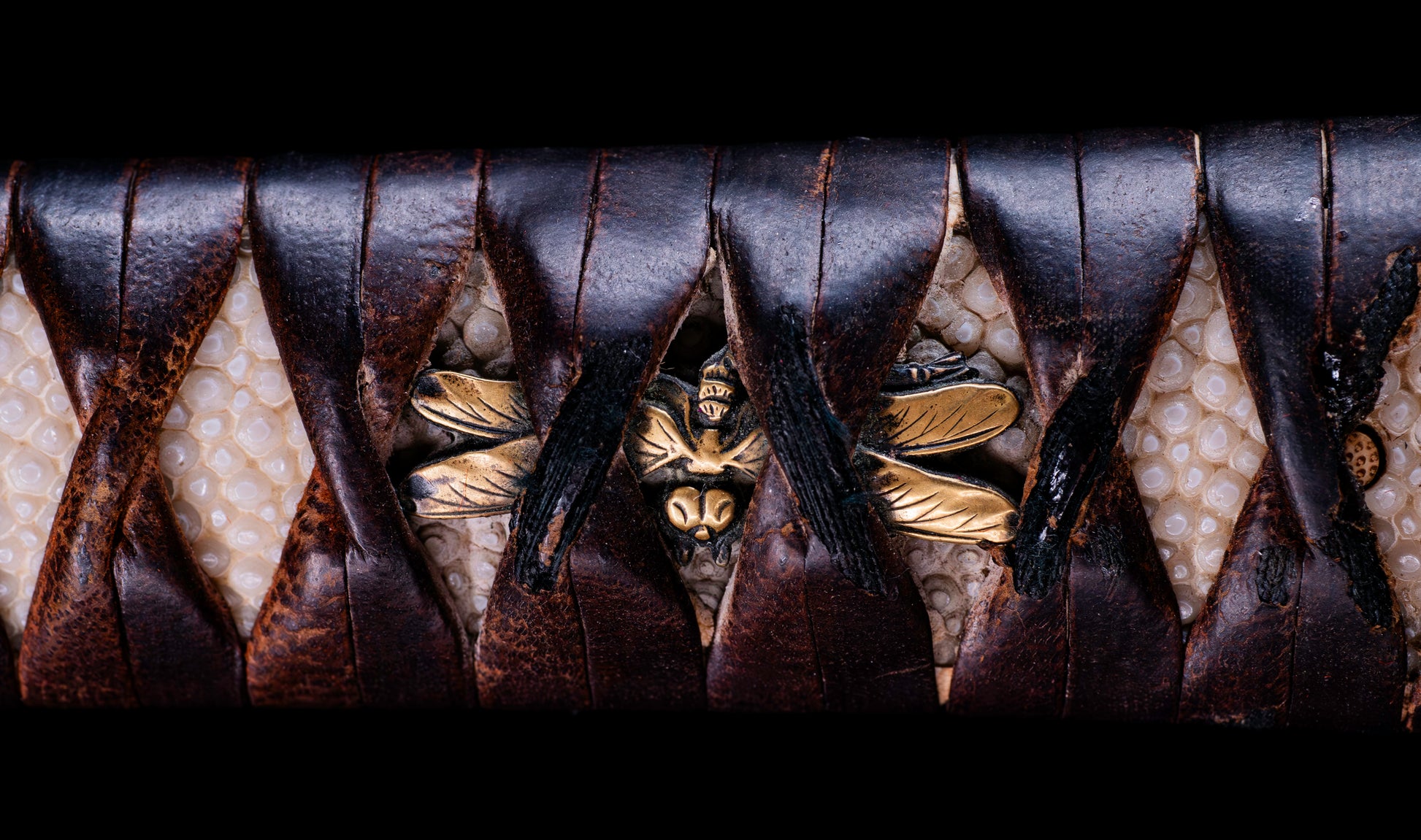 The menuki are the heart of this koshirae's identity. Rendered in shakudō with generous gilt detailing, the paired tombo (dragonfly) figures are depicted with exceptional naturalistic fidelity — wings fully spread and traced with vein-like precision, bodies modeled in the round with careful attention to the insect's distinctive form. In Japanese warrior culture, the dragonfly carried deep symbolic resonance: called kachimushi — "victory insect" — it was prized by samurai precisely because it moves only forward, never retreating. To carry dragonfly menuki was to carry an invocation of forward momentum, relentless advance, and ultimate victory. The prominence and quality of these menuki transforms an already distinguished koshirae into one with genuine iconographic and symbolic weight.