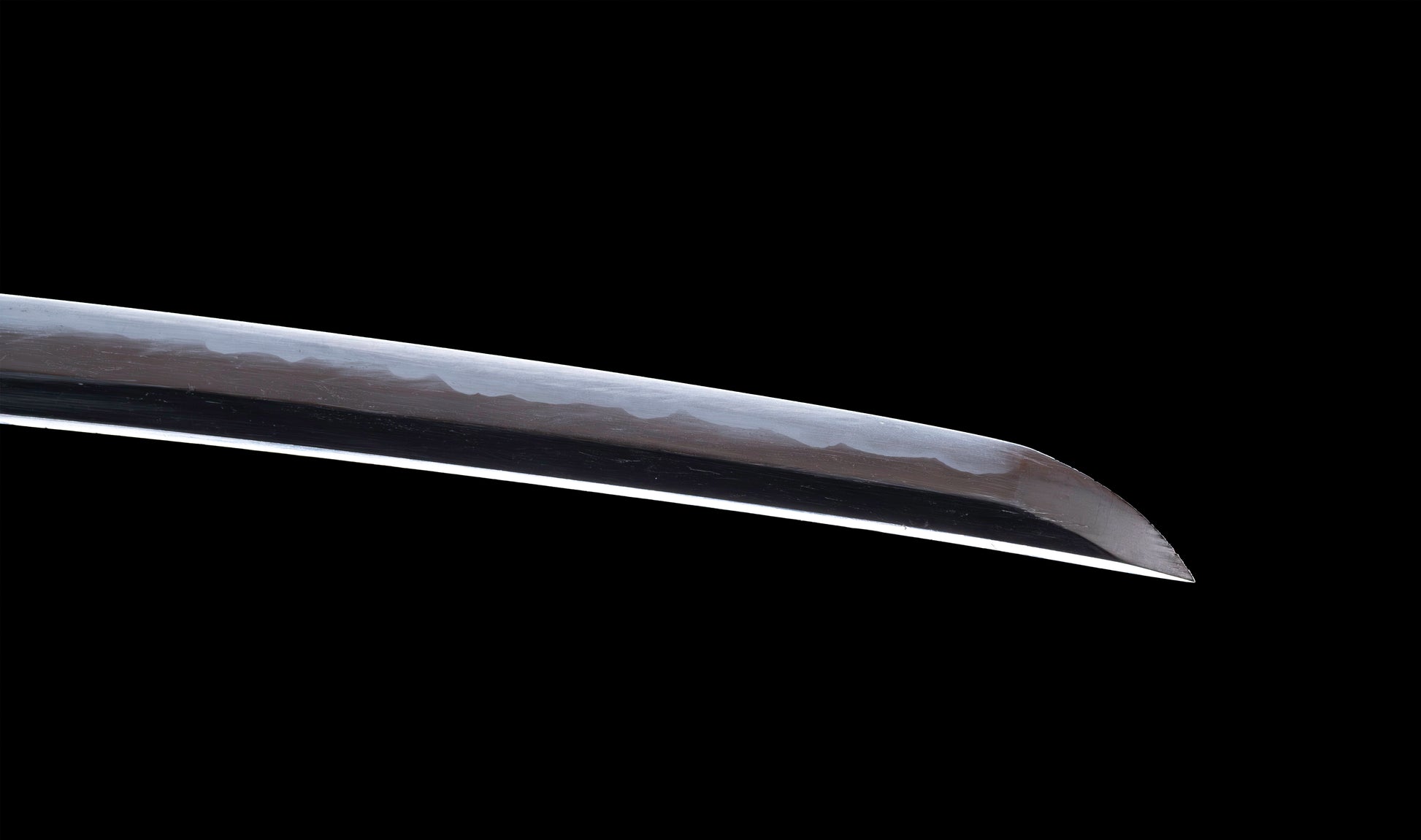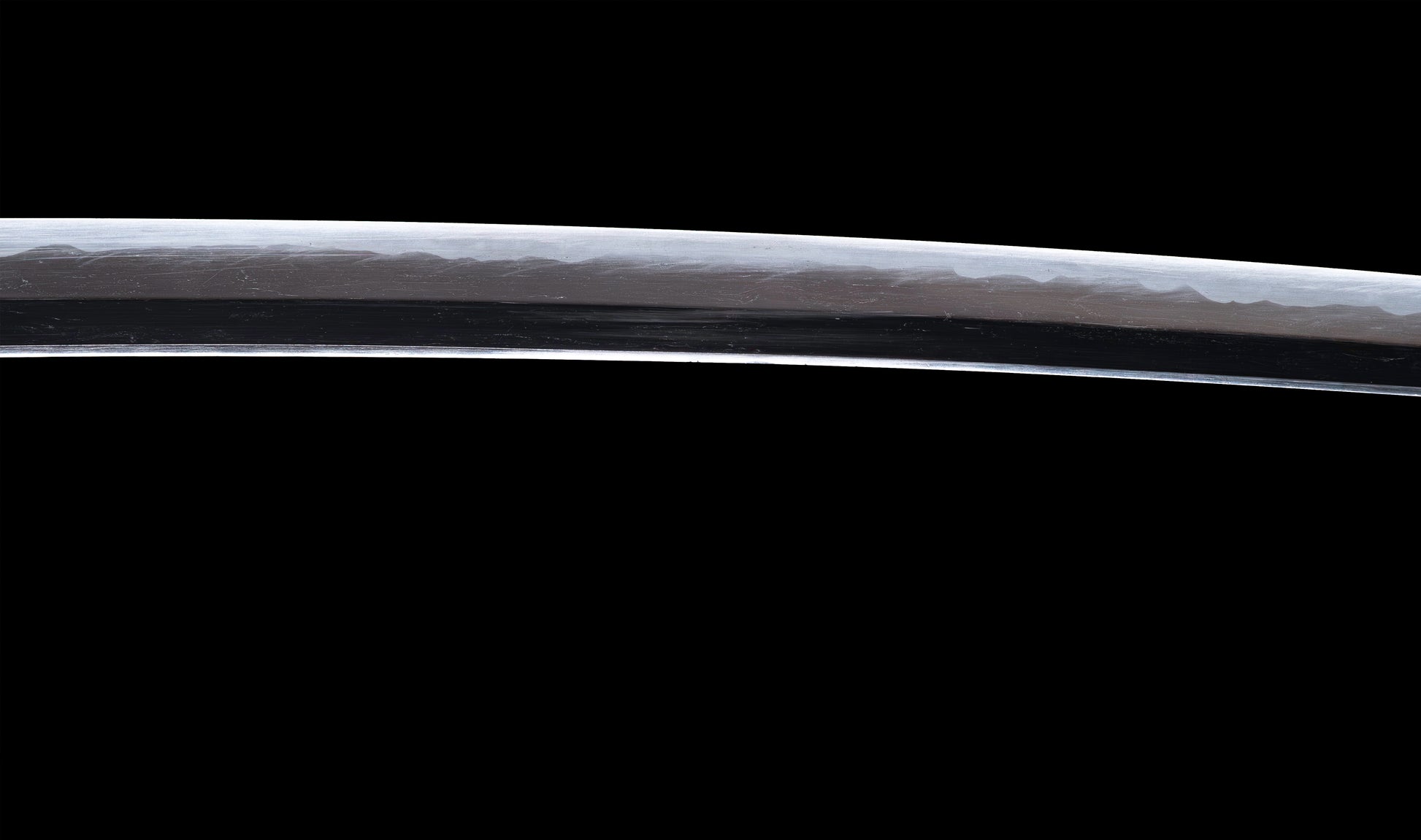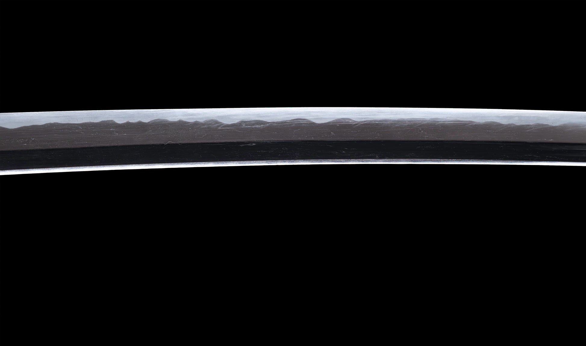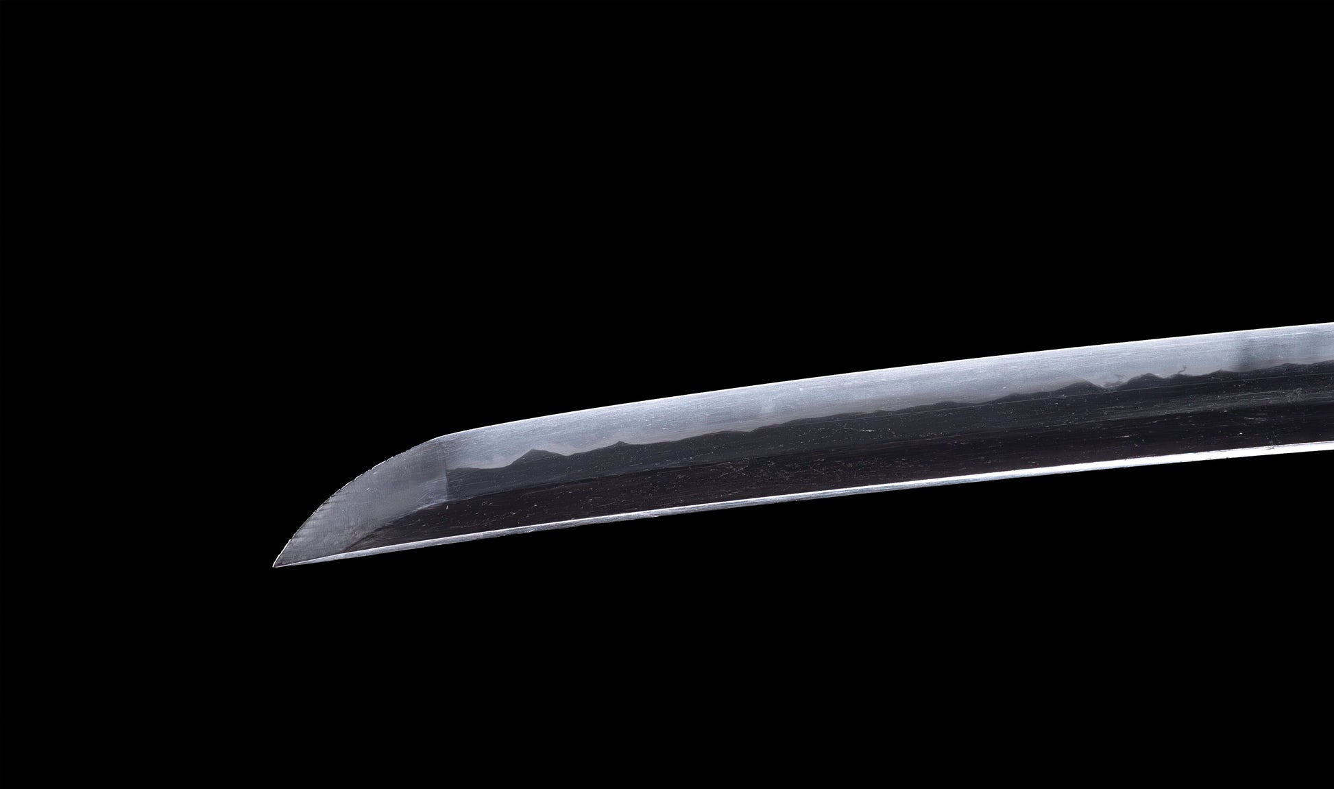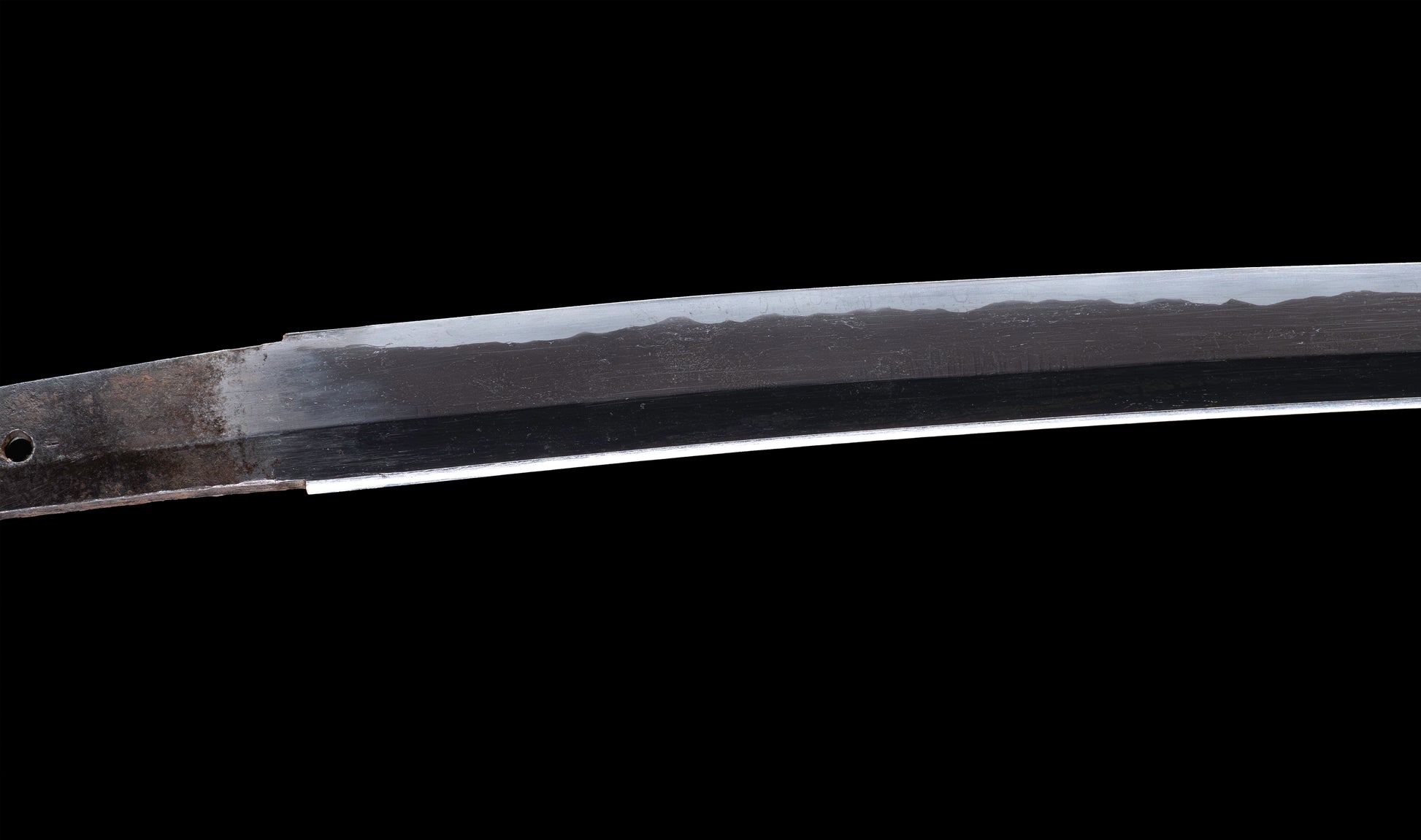 The hamon is the blade's most compelling feature and the source of its immediate visual appeal. A vigorous notare-gunome moves along the entire cutting edge with rhythmic energy — broad, rounded peaks rising and falling in an undulating sequence that fills the yakiba with life and light. The habuchi is populated throughout with active nie, the martensitic crystals catching the light in bright, shifting points that animate the boundary between hard and soft steel. Near the machi, the hamon opens from a composed yakidashi before developing into its full notare-gunome character — a sign of deliberate, controlled tempering rather than hurried production. The ji is dark and well-forged, providing the ideal contrasting ground against which the bright hamon asserts itself. The boshi completes the tempering with a neat ko-maru turnback into the chu-kissaki, the activity continuing cleanly to the very tip of the blade.